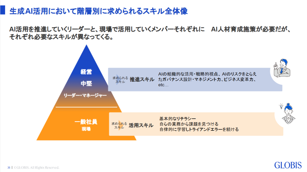 2つ目のポイントは、現場で働く社員全員がAIを理解し、自身の業務で試せるだけの知識とスキルを備えることです。