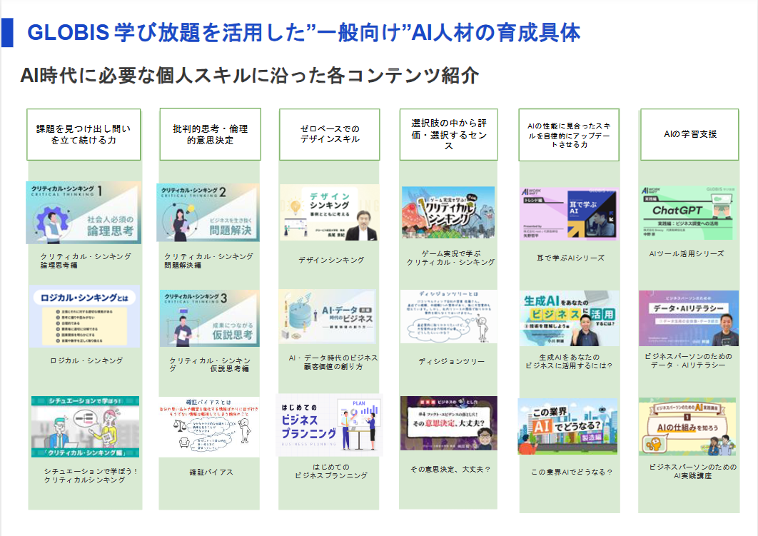 当社グロービスでは、「グロービス学び放題」というeラーニングサービスを提供しています。4,300コース以上の動画が視聴でき、AI活用に特化したコースも110コース(2025年10月時点)ありますので、ぜひご活用ください。