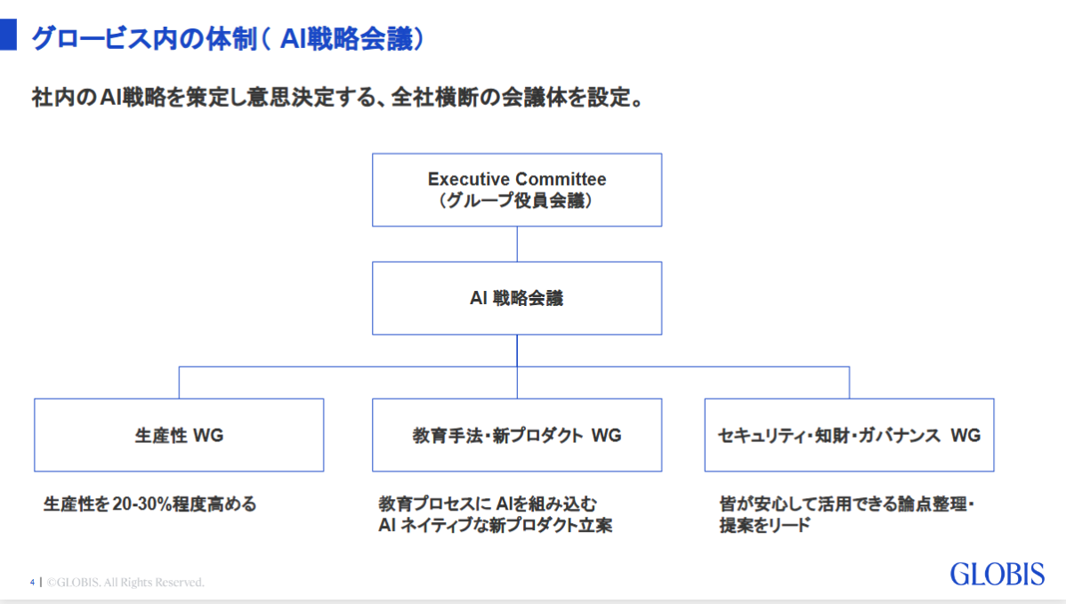 例えばグロービスでは、年初に発表される経営方針の中で「テクノロジーを積極的に活用し、学びとビジネスの可能性を拡張していく」という方向性が打ち出されてきました。この全社方針に基づいて設置された「AI戦略会議」では、AI活用の注力領域を次の3つに定めました。