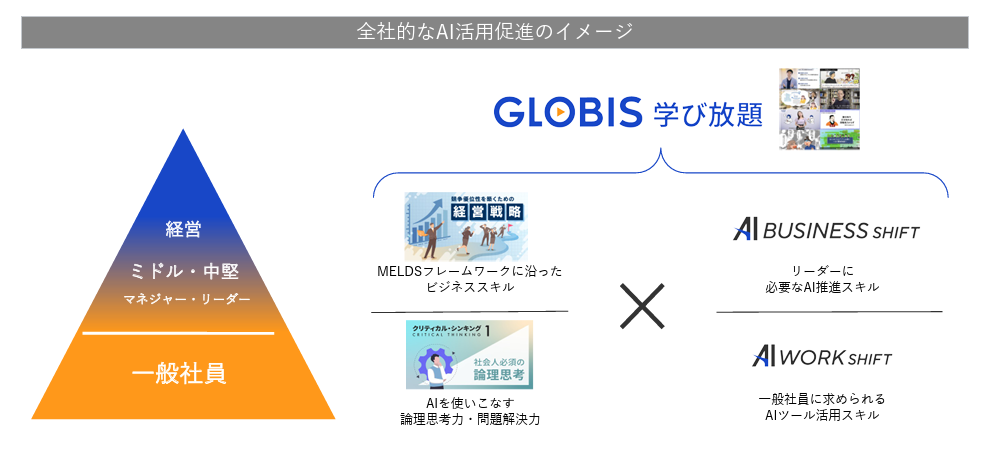 また、AIを組織浸透させるための最適な学びの場として、当社グロービスではeラーニングサービス「GLOBIS 学び放題(以降、グロービス学び放題と記載)」を提供しております。第6章で詳しくご紹介いたしますので是非ご一読ください。